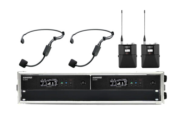 SHUREのワイヤレスマイクシステム。ハーフラックサイズの1chダイバーシティ受信機QLXD4J-JBと、ボディパック型送信機QLXD1、単一指向性のへッドセットマイクPG31の2波セットです。