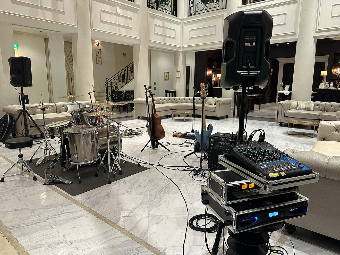 サプライズでの演出をご希望でしたので設営は他のお客様には見れない場所で行い、演奏中の中音を聴きやすくするためにスピーカーを後ろ目に配置いたしました。