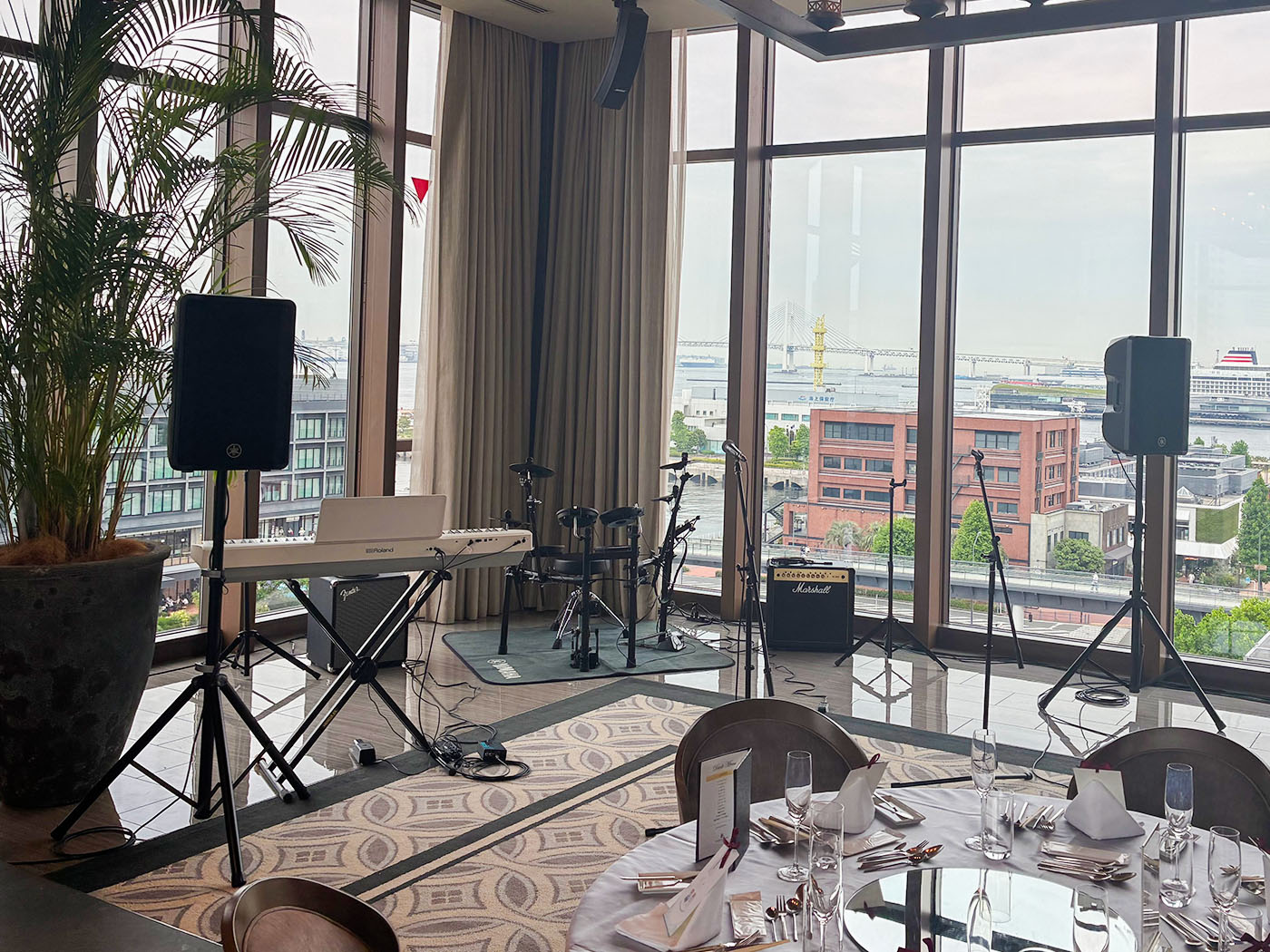 神奈川県横浜市中区にあるグランドオリエンタルみなとみらいにてバンドセットレンタル一式のレンタルとPAオペレートを担当させていただきました!演奏場所の後ろに見える景観が綺麗でとても素敵な式場でした!
