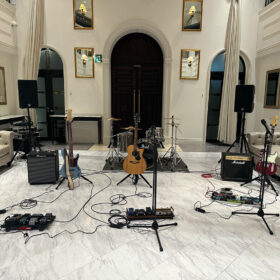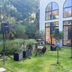 ドラムセットの他、音源再生用にRoland CUBE Street、パフォーマンス用にSHURE SM58を追加レンタルさせていただきました。
