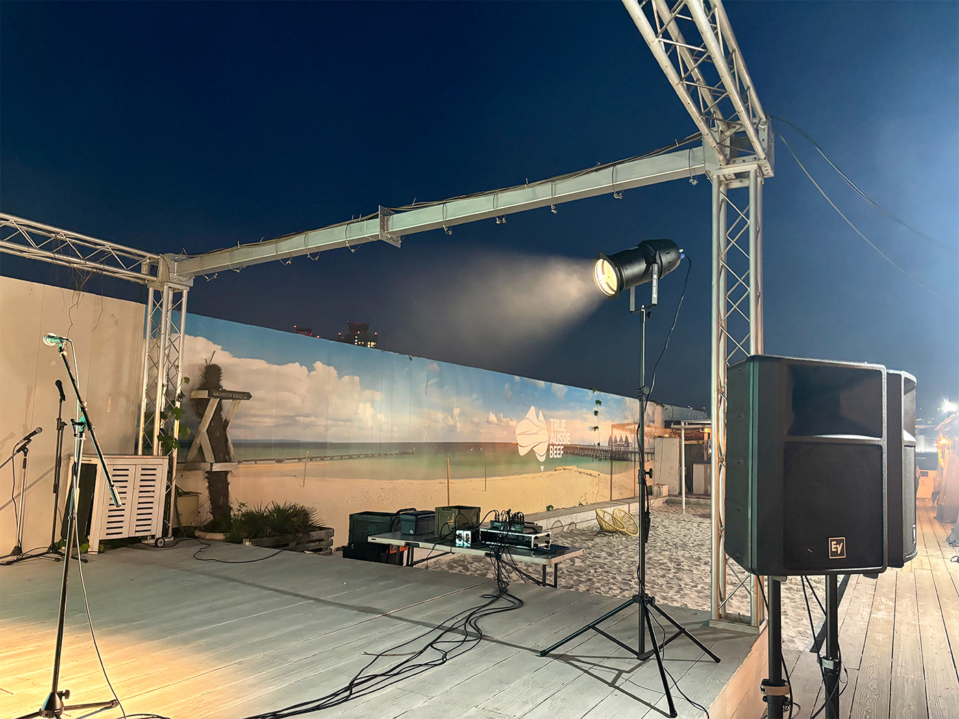 東京都江東区にあるTHE BBQ BEACH in TOYOSUにて音響&照明機材一式のレンタルとPAオペレートを担当させていただきました!バーベキューの煙が自然のスモークとなり、照明も相まって素敵な雰囲気となりました!